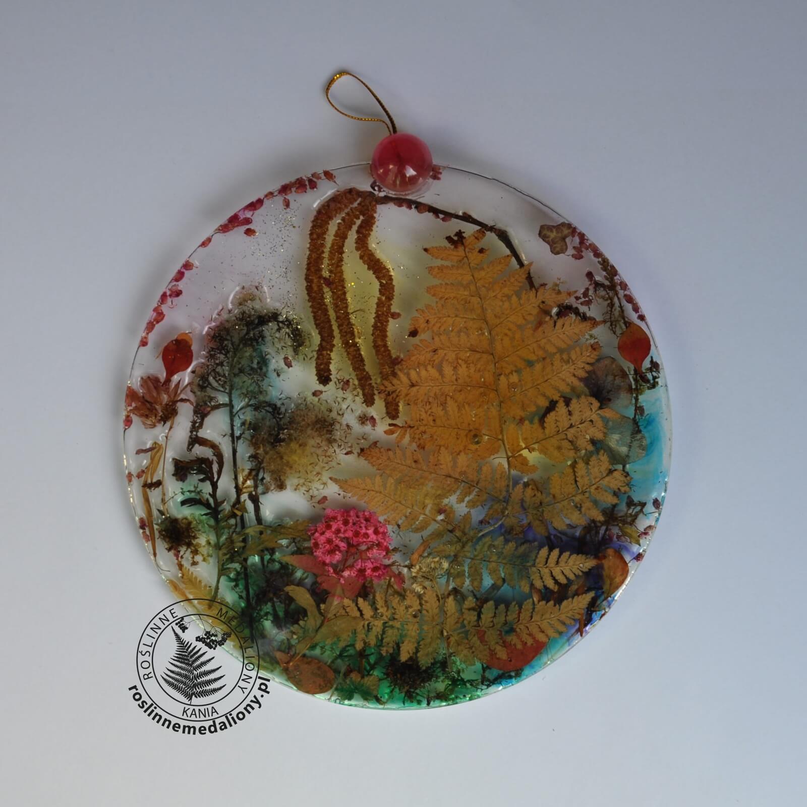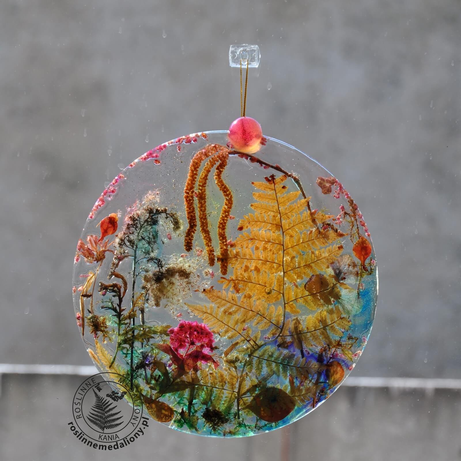Ręcznie wykonany, okrągły medalion z żywicy, w którym zatopiono różnobarwne suszone rośliny, zawieszony na szybie okna.