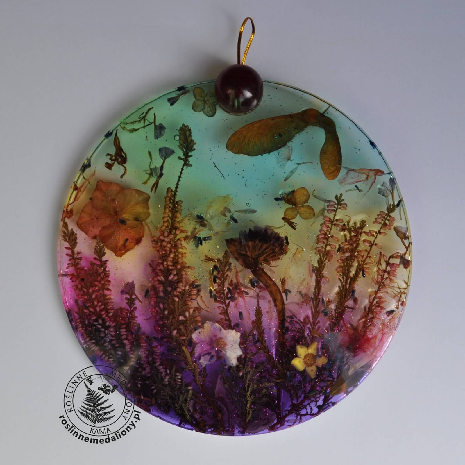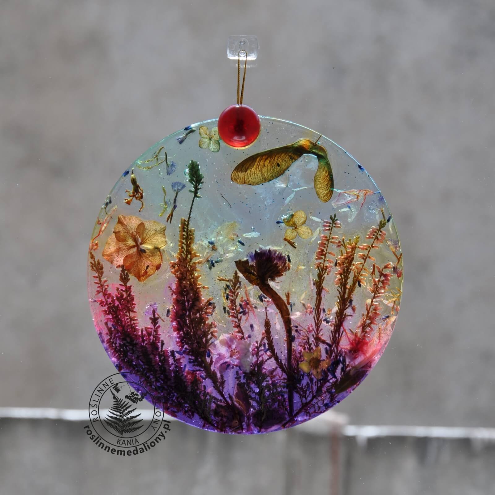 Ręcznie wykonany, okrągły medalion z żywicy, w którym zatopiono różnobarwne suszone rośliny, zawieszony na szybie okna.