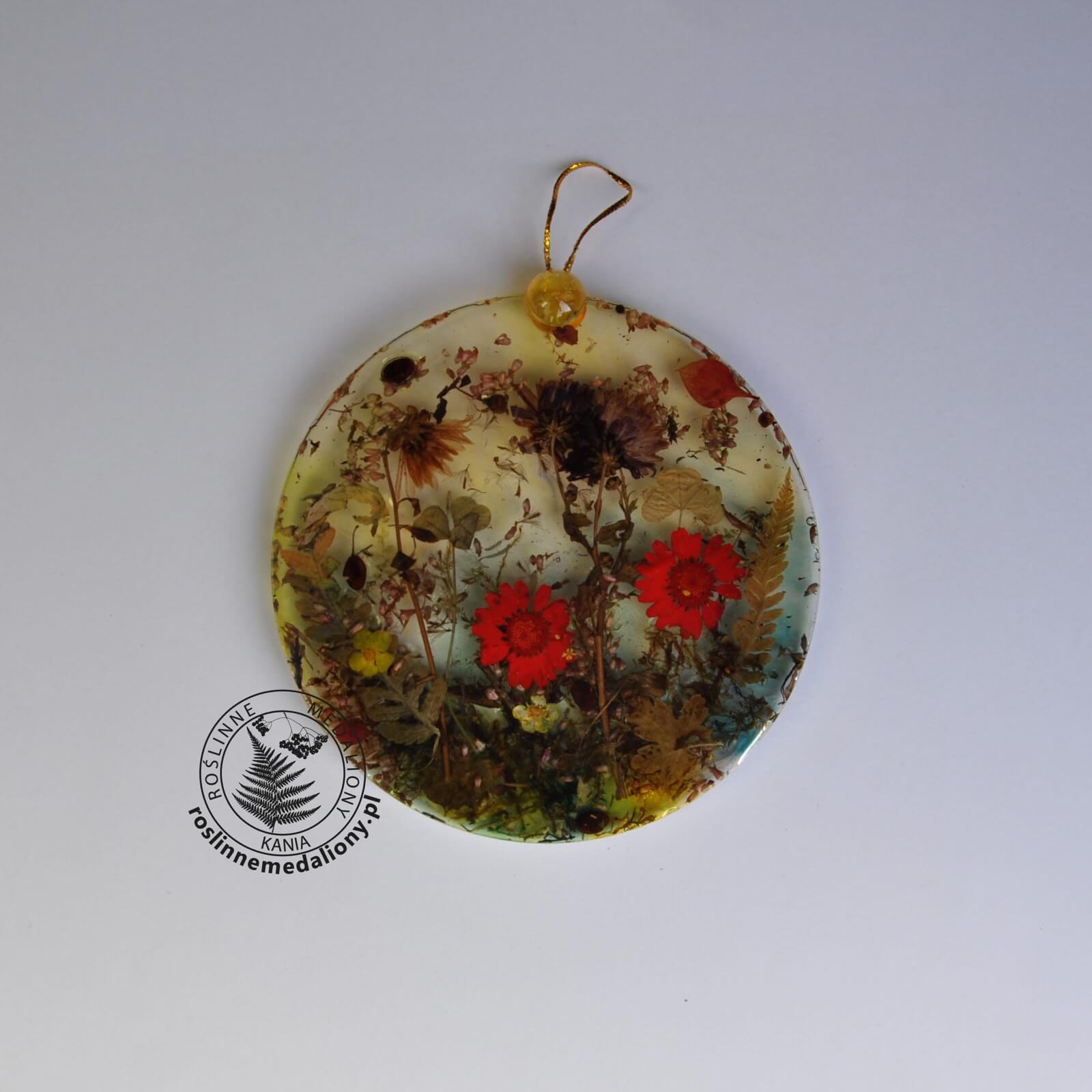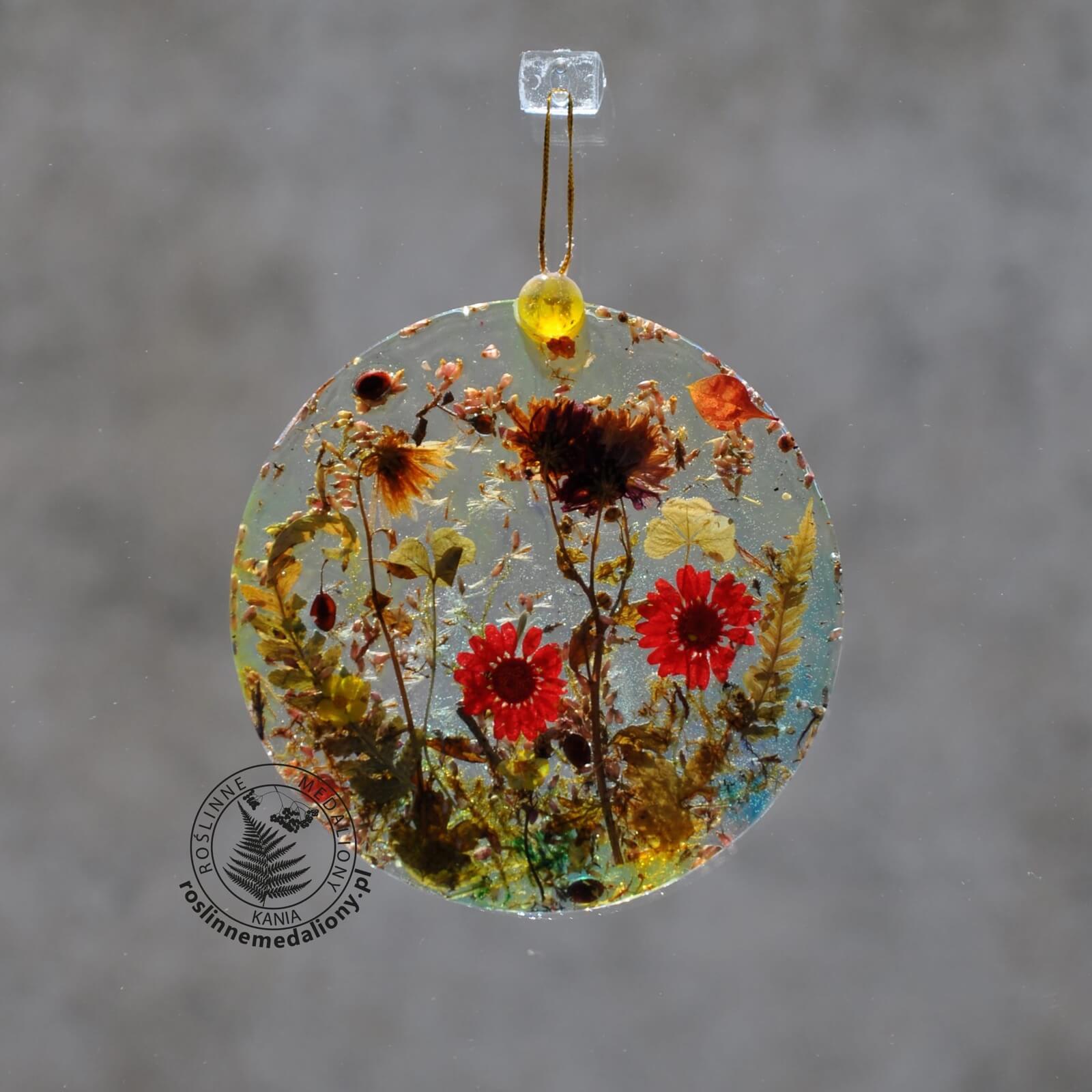 Ręcznie wykonany, okrągły medalion z żywicy, w którym zatopiono różnobarwne suszone rośliny, zawieszony na szybie okna.