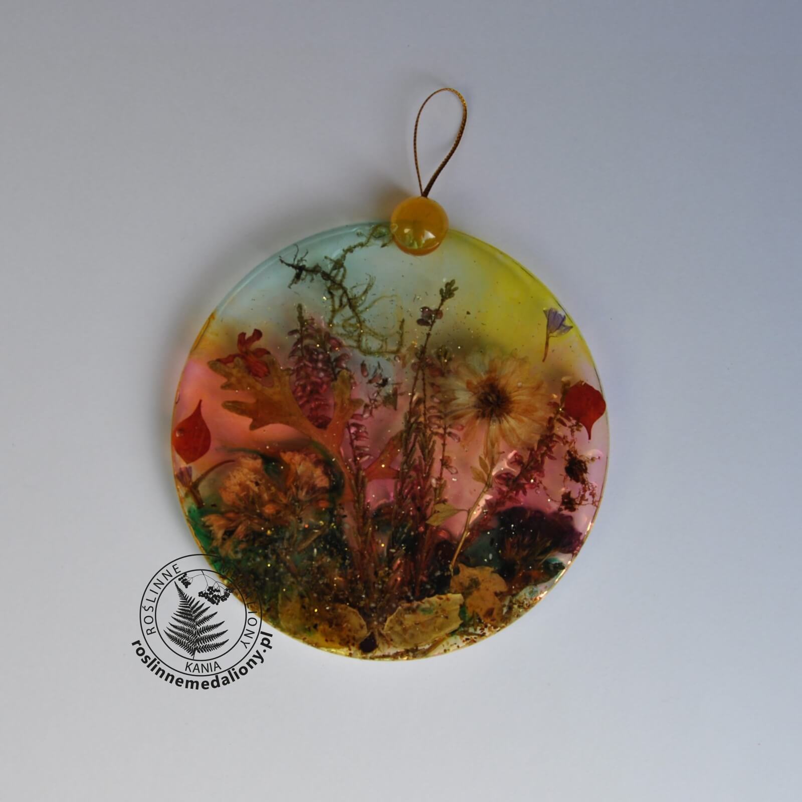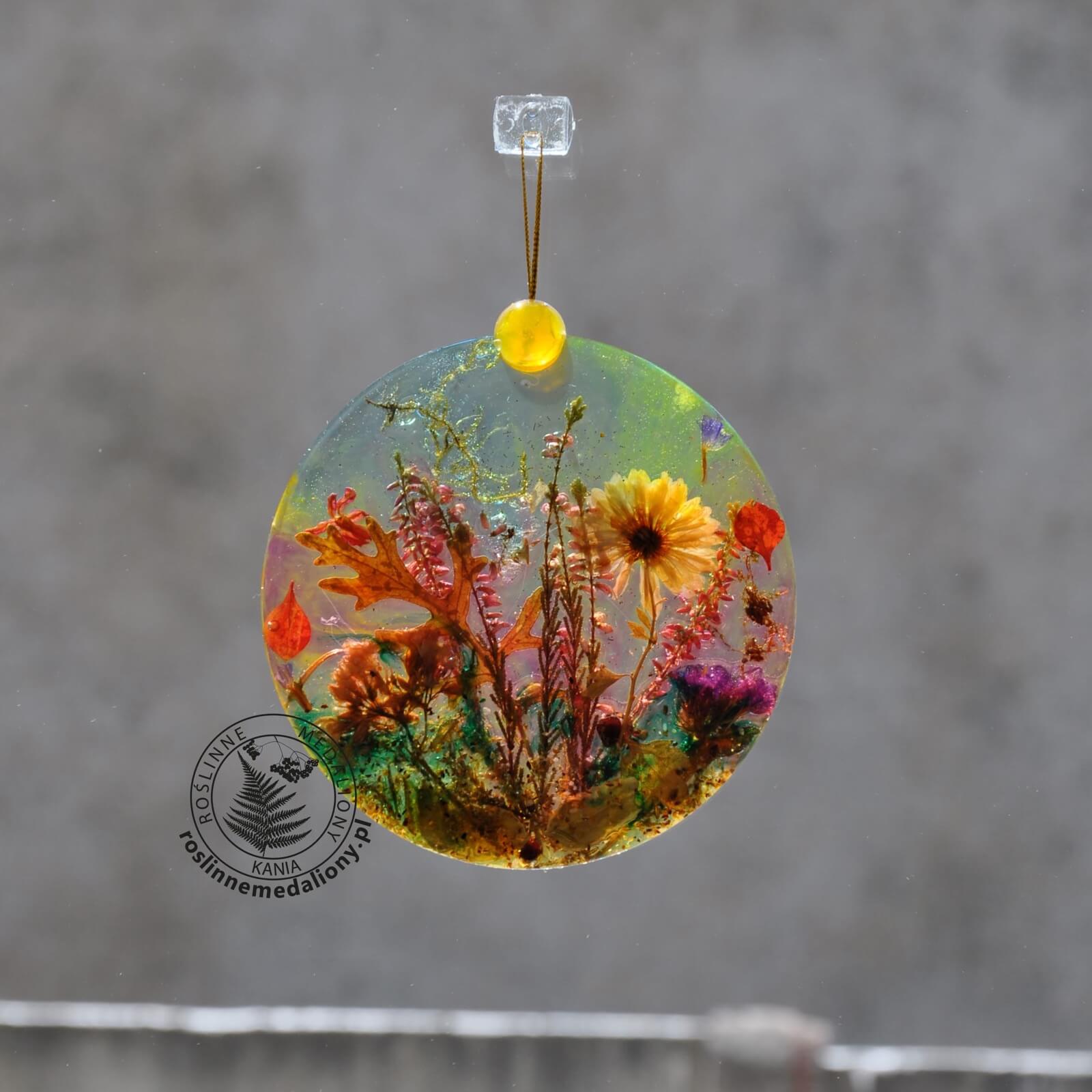 Ręcznie wykonany, okrągły medalion z żywicy, w którym zatopiono różnobarwne suszone rośliny, zawieszony na szybie okna.