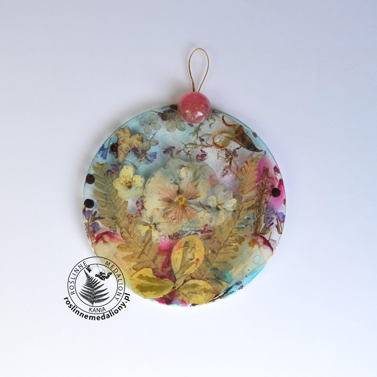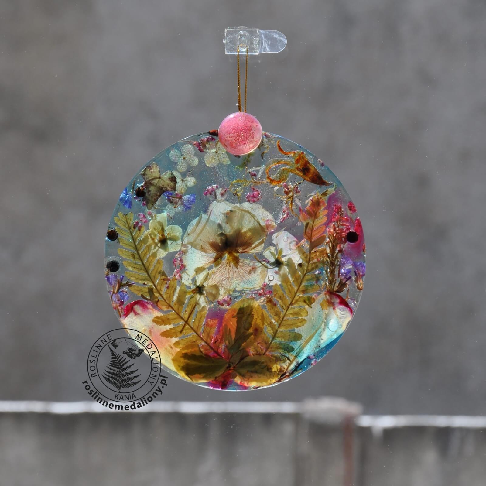 Ręcznie wykonany, okrągły medalion z żywicy, w którym zatopiono różnobarwne suszone rośliny, zawieszony na szybie okna.