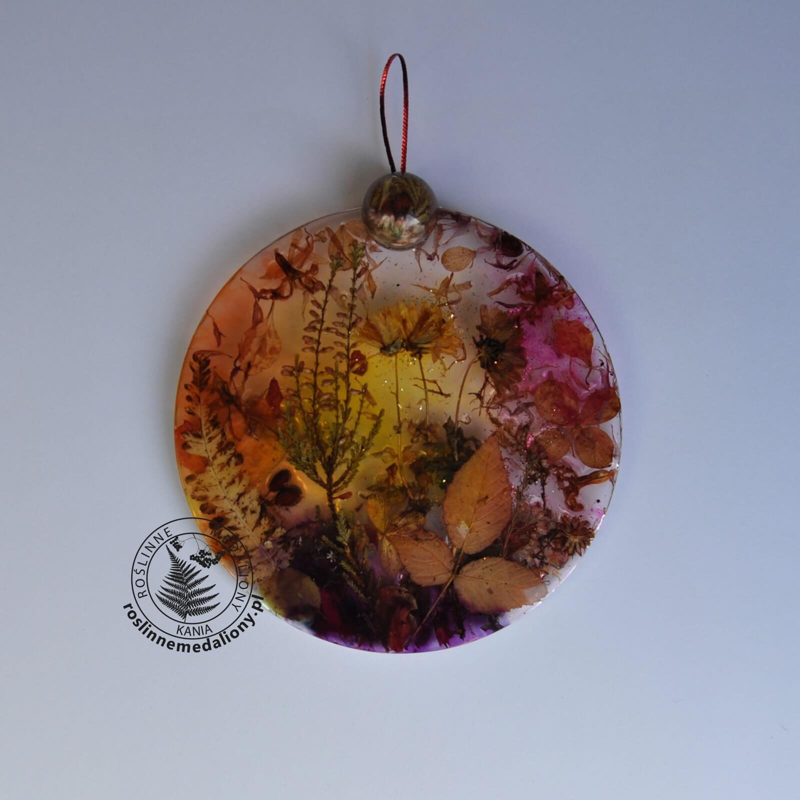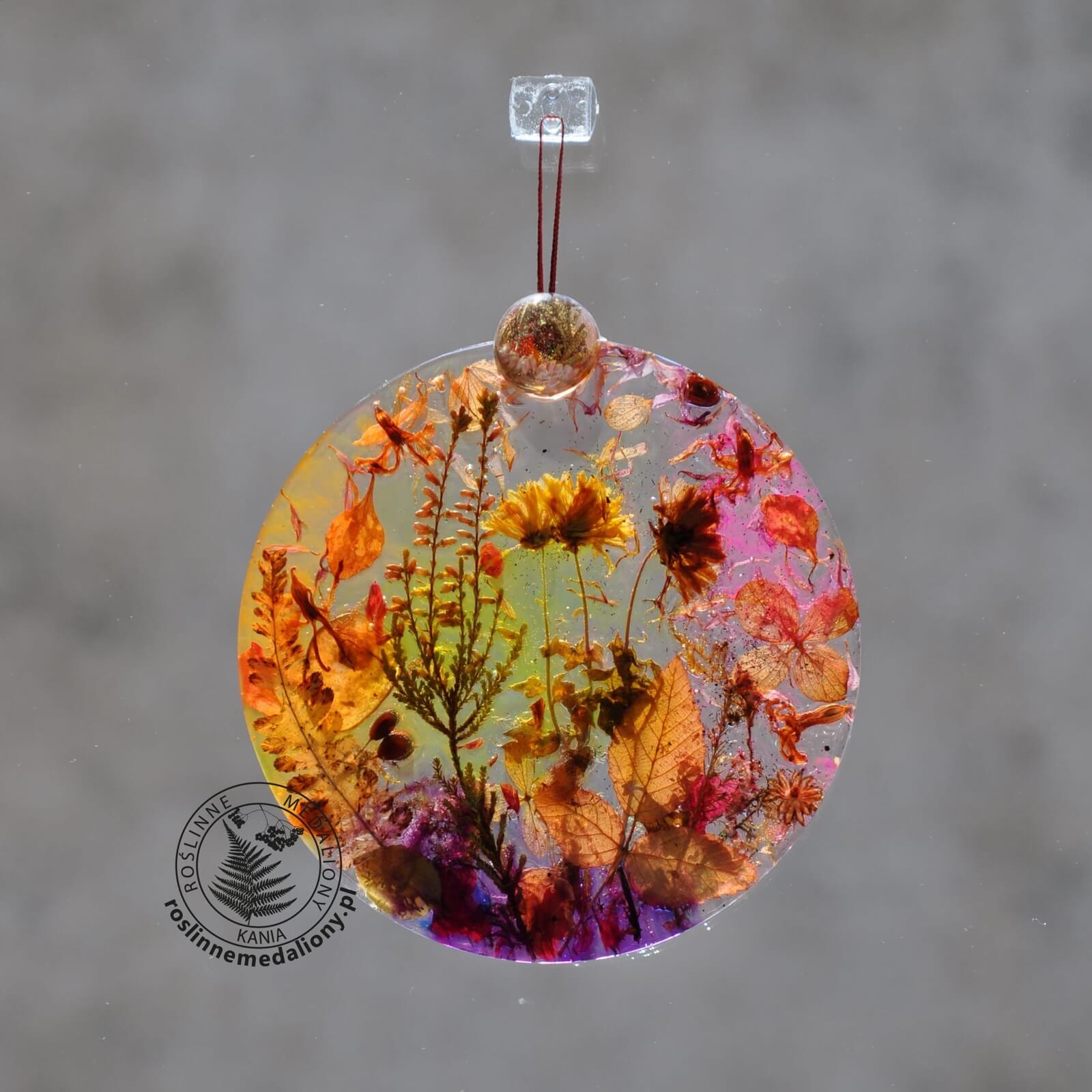 Ręcznie wykonany, okrągły medalion z żywicy, w którym zatopiono różnobarwne suszone rośliny, zawieszony na szybie okna.