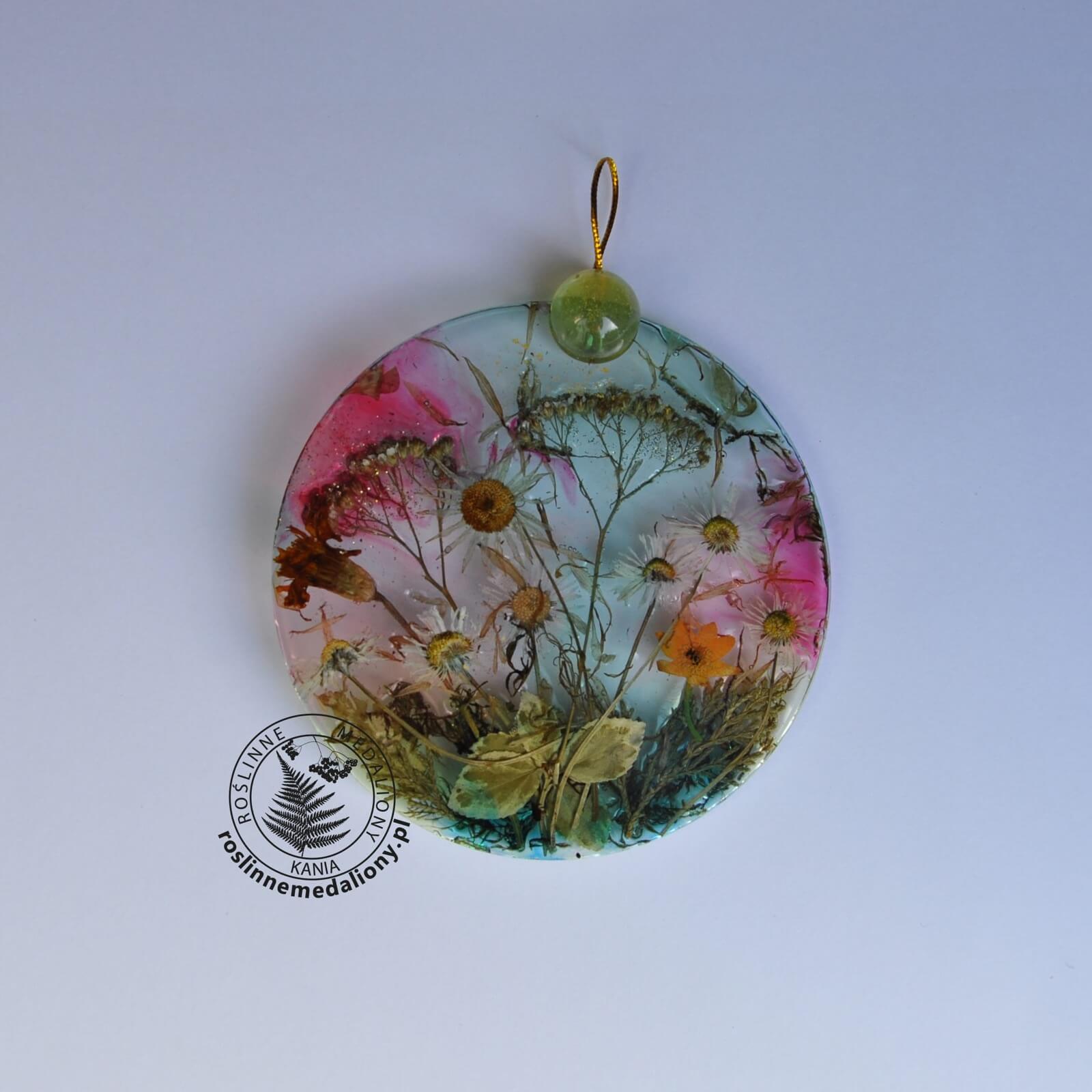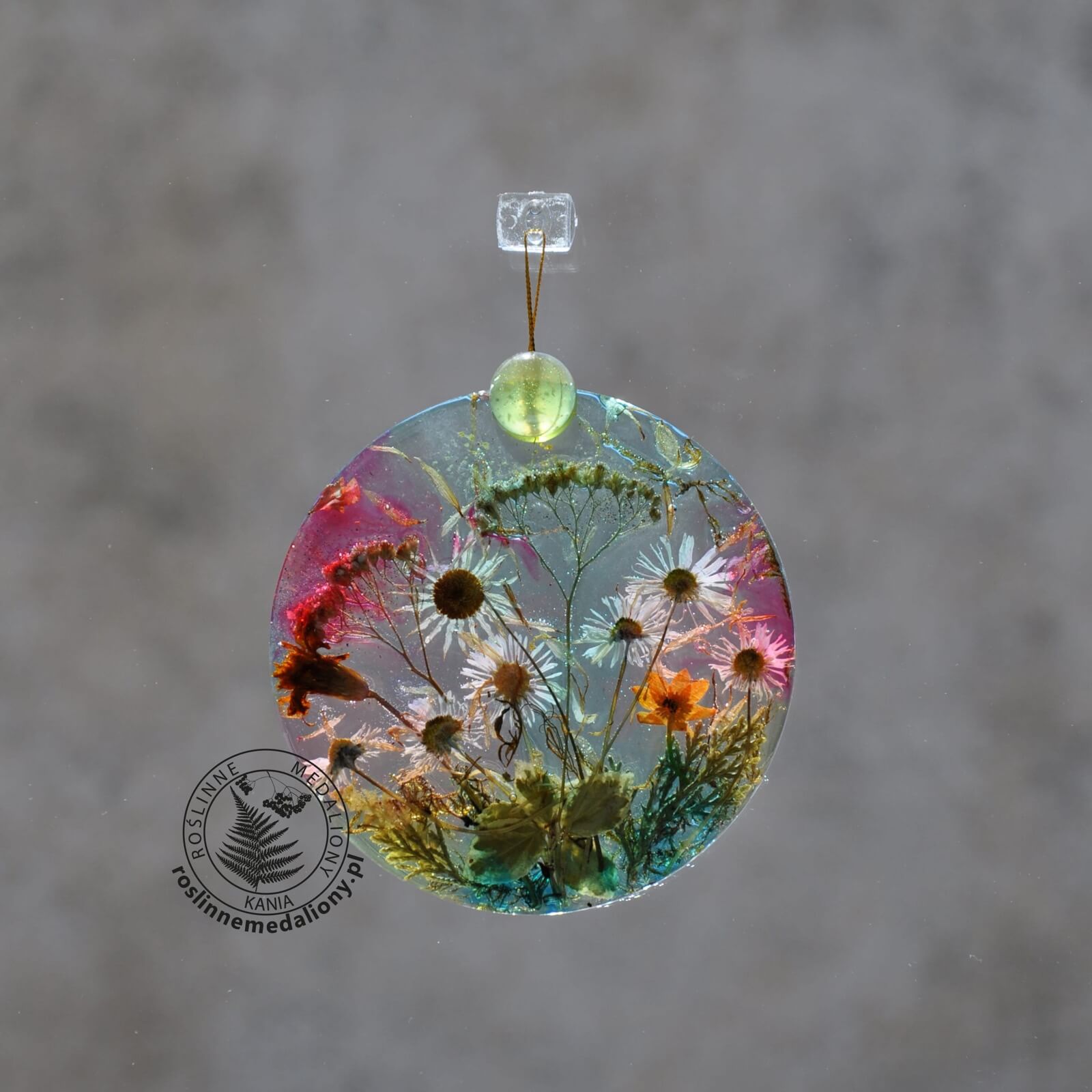 Ręcznie wykonany, okrągły medalion z żywicy, w którym zatopiono różnobarwne suszone rośliny, zawieszony na szybie okna.